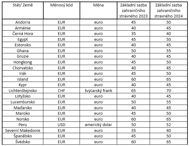 On 24 November 2023, Decree No. 341/2023 Coll. was published in the Collection of Laws, Part 158, on fixing the basic rates of foreign boarding fees for 2024. The basic rates of foreign meal allowances set by the Ministry of Finance pursuant to Section 189(4) of the Labour Code are set out in the Annex to this Decree. The Decree can be found under via this link.