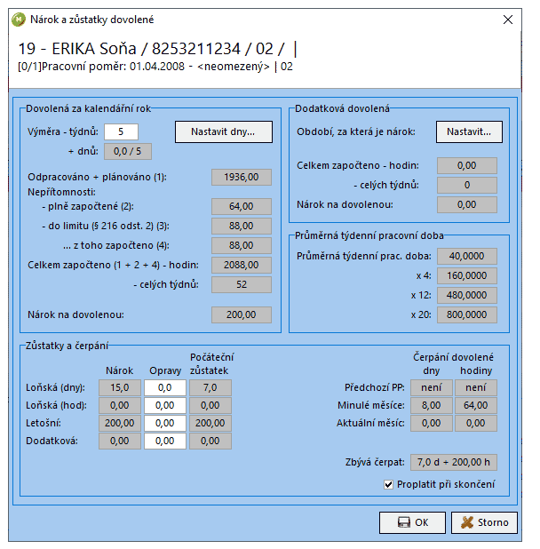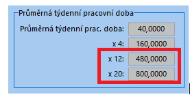 To, kolik hodin tvoří 12násobek a 20násobek týdenní pracovní doby vidíte v okně Nárok a zůstatky dovolené, v části Průměrná týdenní pracovní doba, pole x12 a x20.